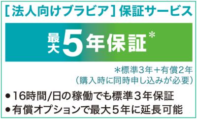 16時間/日の稼働が対象となる3年保証を標準付帯。さらに、有償オプションで保証期間を5年(*)に延長可能です。