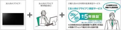 ビジネスに長く貢献し続けるため、法人向けブラビアは導入後の安心も重要視しています。24時間365日の連続稼働でも対象となる3年保証を標準付帯。さらに、有償オプションで保証期間を5年(*)に延長可能です。また民生用モデルとは別に、法人向け専用のサポート窓口を設置。お問い合わせや修理相談も専門オペレーターが迅速に対応します。万が一製品が故障した際には、お客様のもとへ修理エンジニアを派遣。出張訪問での修理対応で業務をサポートします。ソニーでは、商品の販売から修理までを一元的にオペレーション。質の高いお客様対応を提供します。