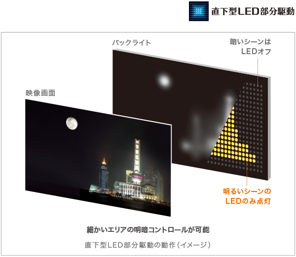 LEDバックライトを液晶パネル下に配置し、映像全体を小さなブロックに分けてコントロールすることで明暗のきめ細かな描写を可能にする「直下型LED部分駆動」搭載。暗いシーンでも奥行や微妙なディテールまで美しく表現します。