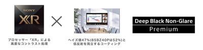 「ディープブラック・ノングレア プレミアム」はプロセッサー「XR」による高度なコントラスト処理とヘイズ値(*)47%(85BZ40Pは52%)と低反射を両立するコーティングを組み合わせることにより映り込み大幅に抑えながら、コントラストの高い高画質を実現するソニー独自の技術です。まぶしさを非常に抑えつつ、深く豊かな黒の表情を表現します。明るい会議室やロビー、店舗など、強い照明や外光が差し込むコンテンツ本来の色味が再現しづらい場所でも見せたい映像をはっきりと鮮やかに表示することができます。
