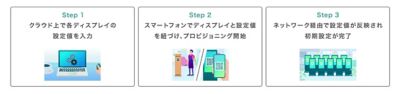 事前にクラウド上でディスプレイの設定値を入力し、現場でスマートフォンでQRコードを読み取り、ディスプレイと設定値を紐づけます。ネットワーク経由で設定値が反映されるので、初期設定のためのリモコン操作なしでディスプレイの運用を開始できます。導入時の作業効率・確実性の向上に貢献します。