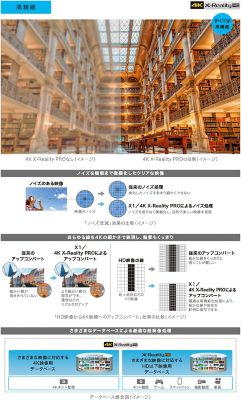 4K⾼画質プロセッサー「X1(エックスワン)」が、精細感、⾊の鮮やかさ、コントラストそれぞれの⾼画質機能をより細かくコントロールして、4K映像の美しさを向上させています。たとえば会議室でのプレゼン資料に表⽰される細かな⽂字・図表・グラフなどを鮮明に描き出すことで情報伝達をスムーズにし、会議や打合せをより効率的に進⾏できます。また、サイネージ⽤途では商品の質感やディテール、シズル感までも表現し、商業施設やショップ、飲⾷店などのPR・販促活動を強⼒にサポートします。