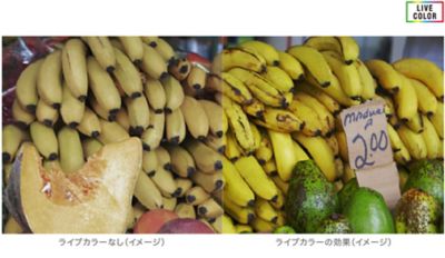 色補正を行う「ライブカラー」機能により、バックライトがもつ、光の三原色(RGB(赤・緑・青))の色域内を最大限に生かし、被写体のもつ色合いを、ソニーオリジナルのアルゴリズムによって、色鮮やかな、魅力的な色合いで表現できます。商品のリアルな色合いを伝えられるなど販促活動に役立ちます。