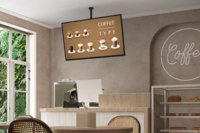 広視野角パネル採用により、左右角度のある場所から見ても輝度や色変化の少ない映像表示が可能。会議時に、角度のない席や後ろの席からも見やすいので、座席レイアウトを選びません。また、天吊り・傾斜設置などサイネージ使用時も高い視認性を確保します。