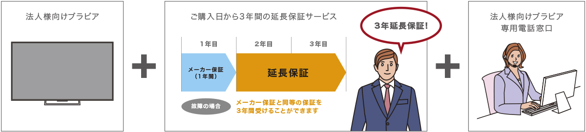 ソニー4K液晶テレビ 法人向けブラビアは、通常モデルがメーカー保証1年に対し、安心の3年間の延長保証付き。さらに専用のブラビア法人様向け電話窓口も開設しているので、お問い合わせや修理相談もすぐにできます。