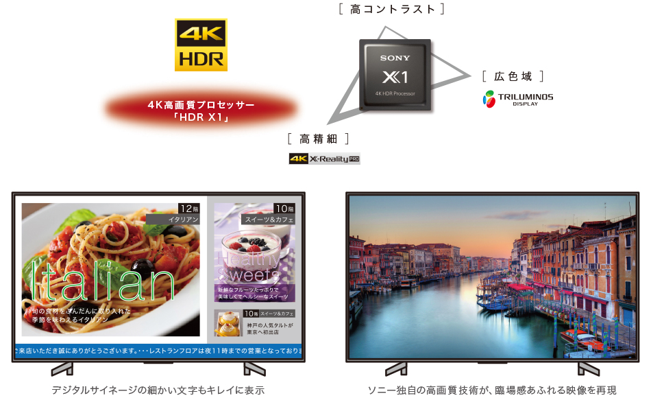 4K解像度パネル+ソニー独自の高画質技術で、新しい映像体験を実現。デジタルサイネージで、綺麗な写真や細かい文字をはっきり表示したり、ホテル/旅館の客室向けテレビを4Kテレビにして、ワンランク上のおもてなしを提案します。