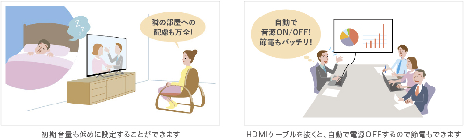 ホテル/旅館の客室向けテレビには欠かせない「最大音量と初期音量の設定」や、「初期起動チャンネル指定」、会議室モニター用途に便利な「信号検出によるテレビの自動起動」など、ビジネス用途に必要な各種設定をすることができます。