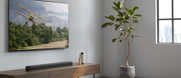 サウンドバー(別売)をテレビの前に置くだけで、3次元の立体音響を臨場感あるサウンドで楽しめます。