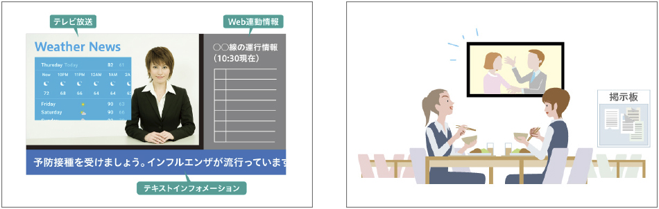 休憩時間中はテレビ番組に切り替えたり、有事の際にニュース番組を映してリアルタイム情報を周知するために役立ちます。