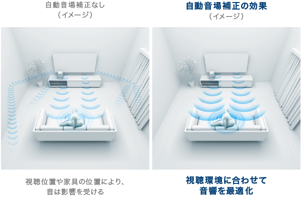 視聴する位置や、部屋の大きさや家具の位置などによって、ディスプレイから視聴者に届く音は影響を受けています。ブラビアならそのような視聴位置や室内環境の影響で変化した音バランスを補正することで、まるでディスプレイの正面で観ているかのような最適な音響で楽しめます。