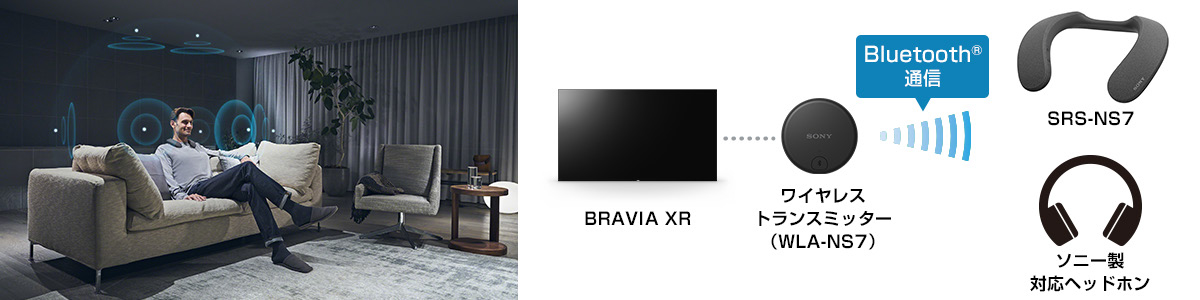 BRAVIA XRとワイヤレストランスミッター(SRS-NS7同梱)を接続し、SRS-NS7や対応ヘッドホンを接続することで、周りの環境を気にせずに、前後左右を中心とした従来のサラウンド音場に高さ方向の表現力を加えた立体音響で、映像をお楽しみいただけます。