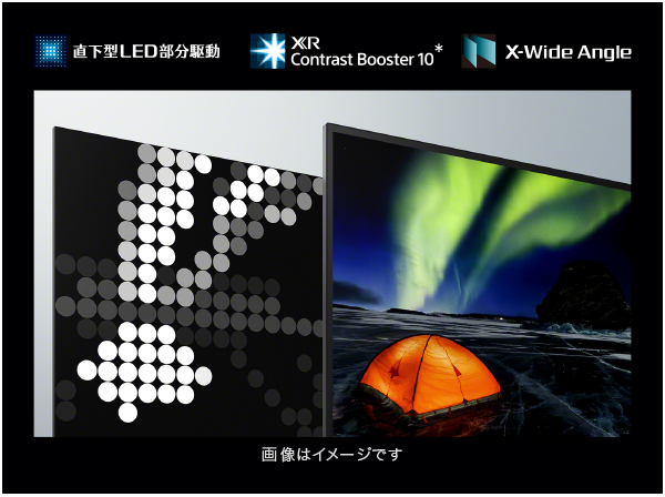 * XR コントラスト ブースターの数値は、「暗部の電流を明部に集中させ明るさを高める機能」の効果の高さと、その精度を表すソニー独自算出による数値、LED部分駆動が搭載されていない当社従来液晶テレビ比です