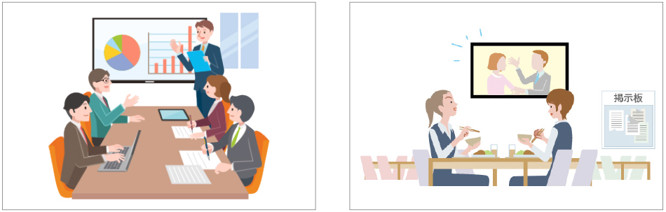 休憩時間中はテレビ番組に切り替えたり、有事の際にニュース番組を映してリアルタイム情報を周知するために役立ちます。