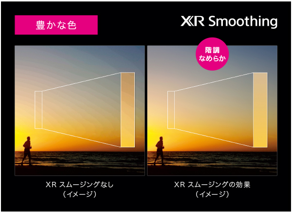 ソニー独自の階調変換機能で地上放送やブルーレイディスクなどの8bit映像や、HDR信号などの10bit映像を14bit相当の階調表現にして出力。刻々と変化する夕焼けの赤や紫など、微妙な色合いもリアルに再現します。