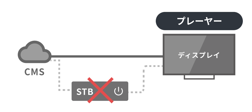 最近では、高性能SoC*を搭載したディスプレイが登場し、STB無しでコンテンツを表示することができるデジタルサイネージがあります。シンプルな機器構成でメンテナンス性が高いサイネージを運用できます。