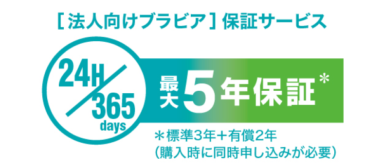 24時間365日の連続稼働*1でも対象となる3年保証を標準付帯。さらに、有償オプションで保証期間を5年*2に延長可能。また、民生用モデルとは別に、法人向け専用のサポート窓口を設置。お問い合わせや修理相談も専門オペレーターが迅速に対応します。万が一商品が故障した際には、お客様のもとへ修理エンジニアを派遣。修理対応で業務をサポートします。