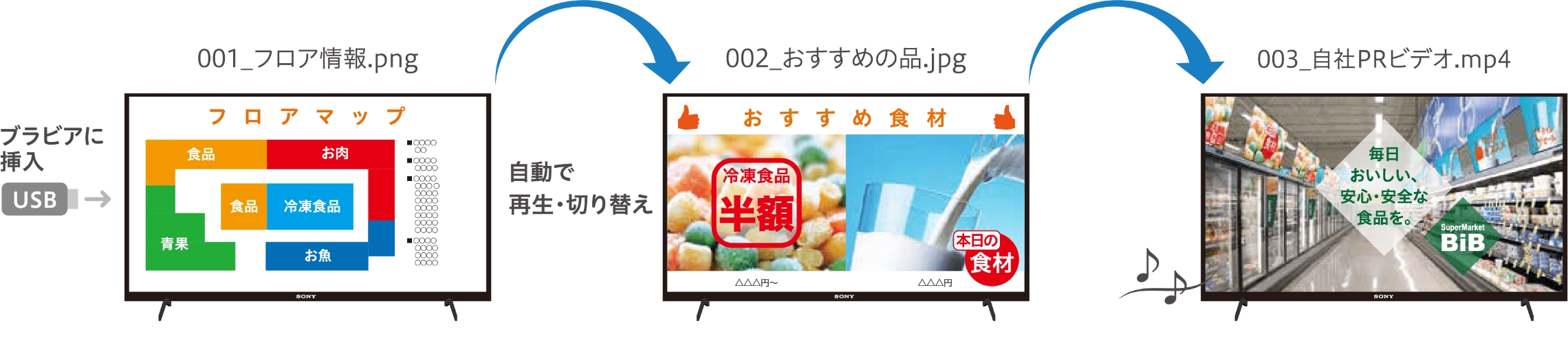 USBメモリー内の指定フォルダの中に静止画や動画データを保存するだけでファイル名の昇順に自動で再生されます。
