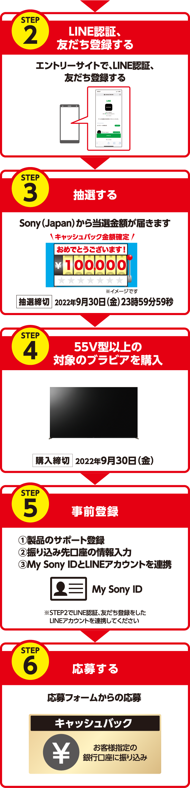 ※My Sony IDとLINEアカウントの連携がされていない場合などで当選結果が確認できない場合は一律10,000円のキャッシュバックとなりますのでご注意ください。