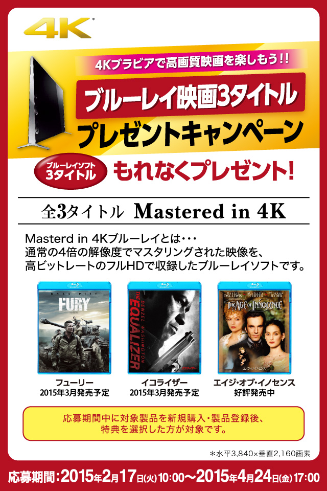 ※プレゼント商品の“Mastered in 4K”ブルーレイソフトを再生するにはブルーレイディスクプレーヤーなどの再生機器が必要です。