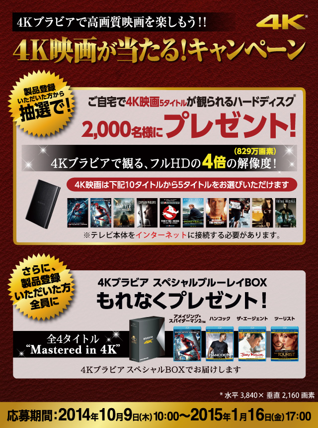 ※プレゼント商品の“Mastered in 4K”ブルーレイソフトを再生するにはブルーレイディスクプレーヤーなどの再生機器が必要です。