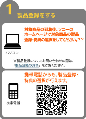 ※キャンペーンへの応募は、対象機種をお買い上げいただき、ソニーのホームページ゙で「製品登録」した上でおこなっていただきます。製品登録には、製品に同梱の製品登録用番号が必要です。