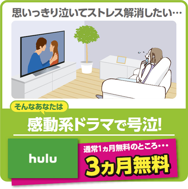 ![思いっきり泣いてストレス解消したい・・・そんなあなたは感動系ドラマで号泣![hulu]通常1ヵ月無料のところ・・・3ヵ月無料](images/example_img01.jpg)