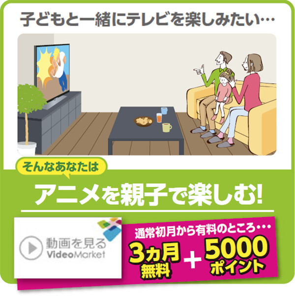 ![子どもと一緒にテレビを楽しみたい・・・そんなあなたはアニメを親子で楽しむ![Video Market]通常初月から有料のところ・・・3ヵ月無料+5000ポイント](images/example_img02.jpg)
