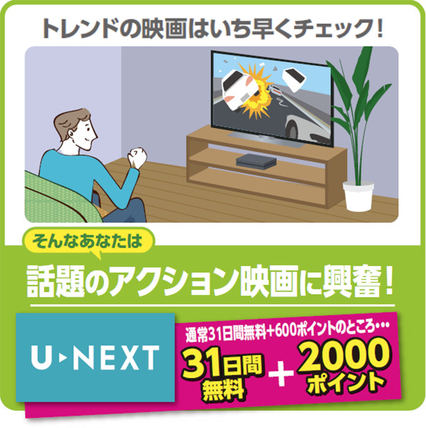 ![トレンドの映画はいち早くチェック!・・・そんなあなたは話題のアクション映画に興奮![U-NEXT]通常31日間無料+600ポイントのところ・・・31日間無料+2000ポイント](images/example_img03.jpg)