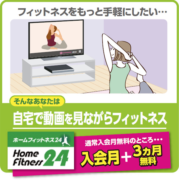 ![フィットネスをもっと手軽にしたい・・・そんなあなたは自宅で動画を見ながらフィットネス[ホームフィットネス24]通常入会月無料のところ・・・入会月+3ヵ月無料](images/example_img04.jpg)