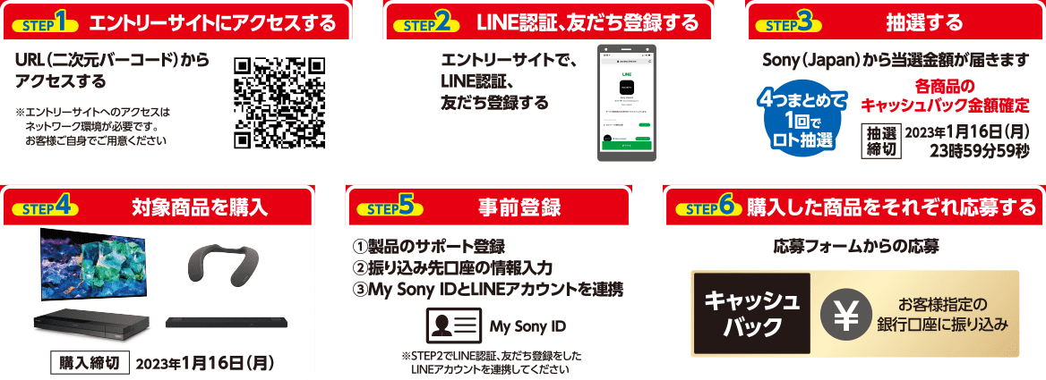 ●本キャンペーンはMy Sony IDと抽選されたLINEアカウントの連携が必須となっております。My Sony IDとLINEアカウントの連携がされていない場合などで当選結果が確認できない場合は各商品の最低金額のキャッシュバックとなりますのでご注意ください。