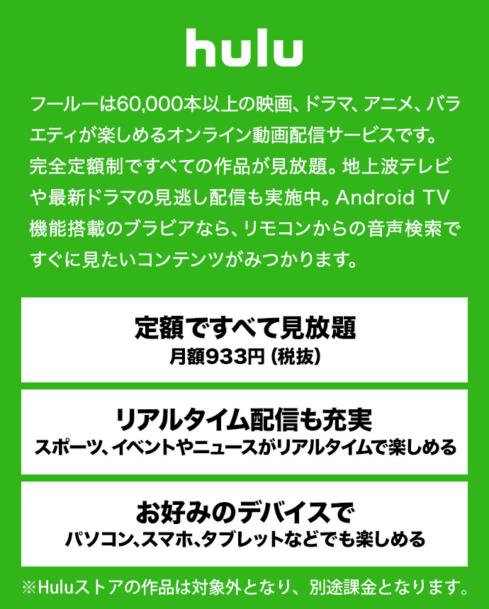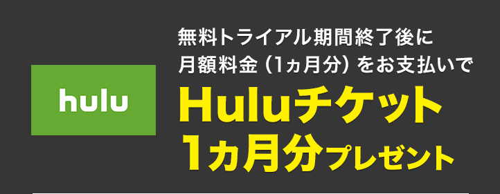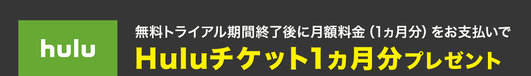 ・本キャンペーンは、新規登録ユーザーのみ対象となります。 ・サービスの利用登録にあたっては、クレジットカードなどの決済方法の登録が必要です。 ・サービスの無料期間中に解約をせず当該期間が終了すると、自動的に有料期間に移行し、支払い義務が生じますので、ご注意ください。 ・Huluチケットで登録する場合、無料トライアルが適用されません。 ・継続特典あり