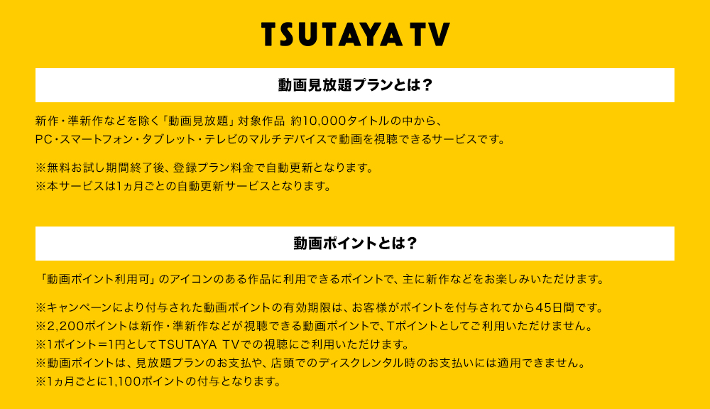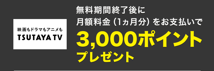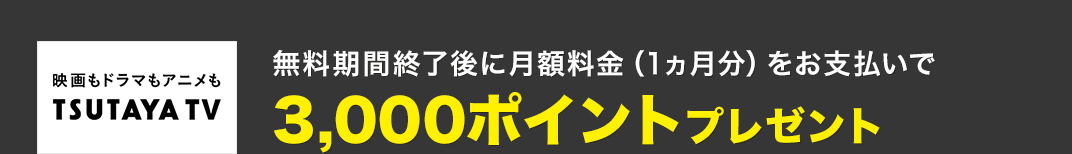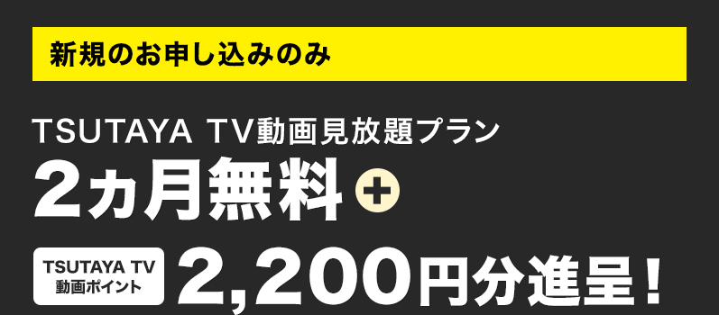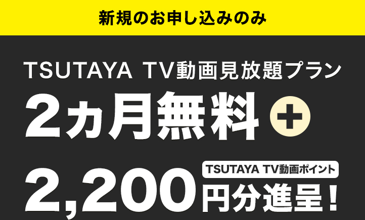 ・本キャンペーンのご利用には、クレジットカードの登録が必要です。 ・本キャンペーンは「TSUTAYA TV動画見放題プラン」を新規にお申し込みいただいたお客様が対象となります。 ・サービスの無料期間中に解約をせず当該期間が終了すると、自動的に有料期間に移行し、支払い義務が生じますので、ご注意ください。 ・契約中の途中解約も可能です。 ・継続特典あり