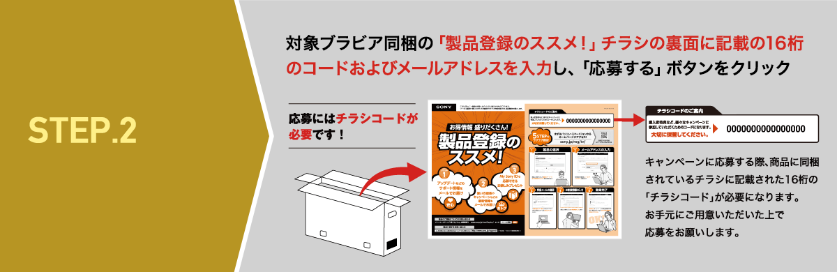 対象ブラビア同梱の「製品登録のススメ!」チラシの裏面に記載の16桁のコードおよびメールアドレスを入力し、「応募する」ボタンをクリック