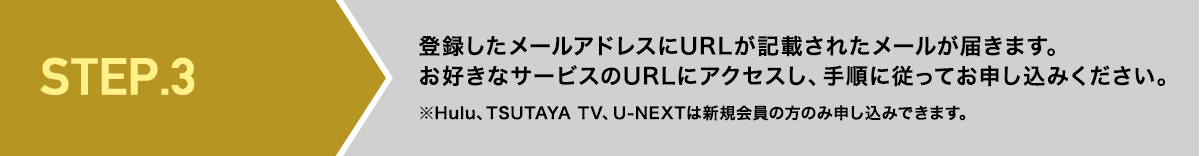 登録したメールアドレスにURLが記載されたメールが届きます。お好きなサービスのURLにアクセスし、手順に従ってお申し込みください。