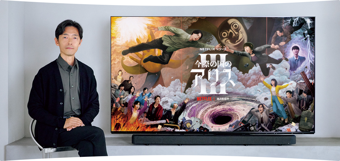 世界中のあらゆる国で、いつでも自分たちの好きな場所やタイミングで観ることのできる配信作品は、視聴者の属性も多様なら、その視聴環境も千差万別だ。佐藤は、細かな部分までこだわり抜いて完成させた映像を最高の環境で観てほしいという願いは抱きつつも、リビングのテレビや手の中のスマホで作品を鑑賞する視聴者の姿は、常に念頭にあると語る。実は、今回の『今際の国のアリス』制作過程において、ソニーのテレビ「ブラビア」が活躍したと佐藤は振り返る。