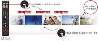 録画中の番組に、チャプター(映像の区切り)を設定します。視聴中にリモコンの「次」ボタンでチャプターを飛ばしたり、「前」ボタンでチャプターの先頭に戻ったりできます。