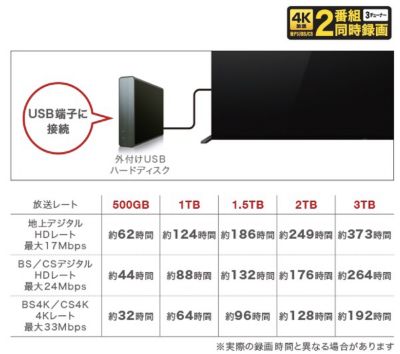 地上放送/BS・CS/BS4K・CS4K、3チューナー搭載なので、番組を見ながら、2K放送でも、4K放送でも、同時刻に放送中の別の2番組を外付けUSBハードディスク(別売)に録画することができます。