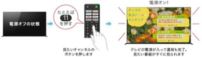 リモコンのチャンネルボタン(数字ボタン)で電源が入り、見たい番組をすぐに視聴できます。