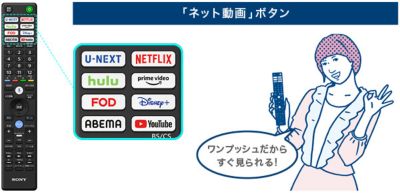 「U-NEXT」「Netflix」「Hulu」「Prime Video」「FOD」「Disney+」「ABEMA」「YouTube 」ボタン搭載で、テレビの電源がオフの状態でも、ワンプッシュでかんたんにアプリを起動できます。