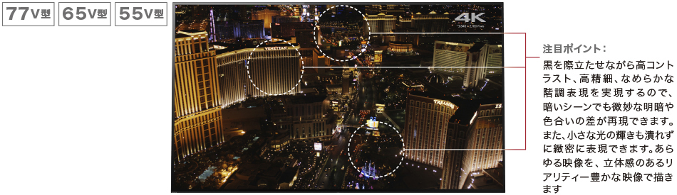 ソニーのテレビ史上最高画質モデル「Z9Dシリーズ」にも搭載の4K高画質プロセッサー「X1 Extreme」が、優れた映像分析能力で有機ELパネルの特性を認識してパネルの映像表現力を最大限に引き出します。また、コントラスト、精細感、色の鮮やかさなどの映像のリアリティーを向上させる高画質技術と連携することで、黒の締まりや光の表現力を高め、息をのむような高画質を実現します。吸い込まれるような深い黒や小さな光の輝き、暗いシーンでの奥行き感にご注目ください。