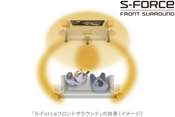 映画館で使われているマルチサラウンドスピーカーシステムの音場をテレビのスピーカーだけでバーチャルに再現する技術「S-Force フロントサラウンド」。横から後ろへと音が移動する立体的な音場を体感できます。