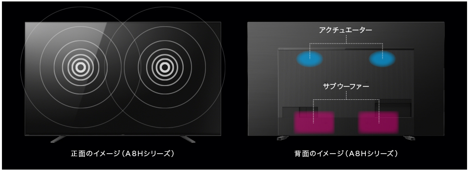 画面そのものを振動させて高音質を創出するアクチュエーターを画面背面の左右に搭載。さらに、背面下部に低音をになうサブウーファーを左右それぞれに設置するなど、高音質のために新たな構造を採用しました。また、内部部品の細部にまで改良を加えることで、テレビ1台でリアルな臨場感を実現しています。