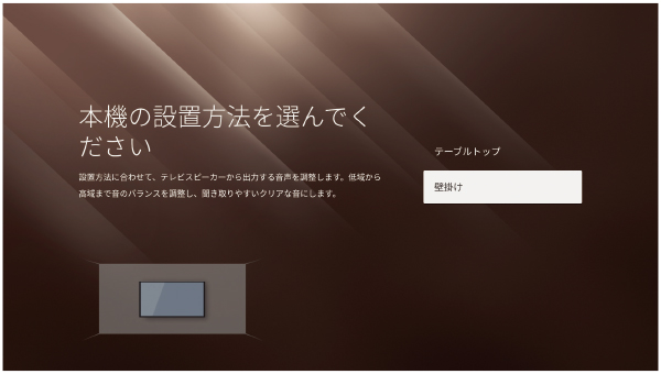 初期設定時にテーブルトップ、または壁掛けに最適な音質に設定することが可能です。「音質・音声設定」→「スピーカー特性」からも選択できます。