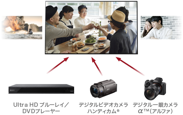 Ultra HD ブルーレイ/DVDプレーヤーやブルーレイディスクレコーダー、4K対応ハンディカムや4K対応カメラなどの映像を、4Kブラビアならではの美しい画質で楽しめます。