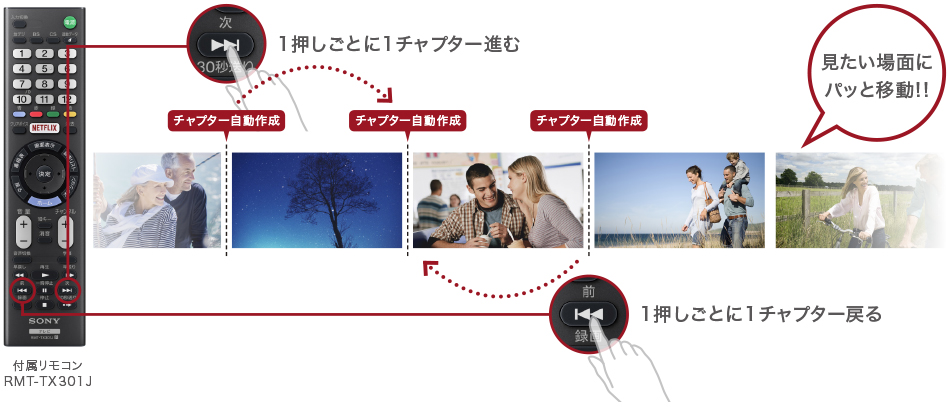 録画中の番組に、チャプター(映像の区切り)を設定します。視聴中にリモコンの「次」ボタンでチャプターを飛ばしたり、「前」ボタンでチャプターの先頭に戻ったりできます。
