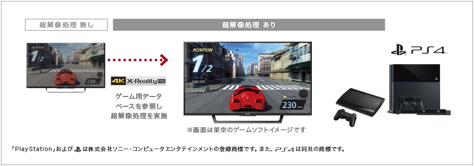 超解像処理の際に、ゲーム用のデータベースを参照し、ゲームに最適な画質を再現する「ゲームモード(*)」を搭載しています。また、画像処理で発生する映像遅延を短縮することで、ストレスのない快適なゲーム体験を実現しました。シビアなタイミングが要求されるゲームであっても、プレイヤーの意図をダイレクトにプレイに反映することが可能です。