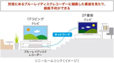 ブルーレイディスクレコーダーの録画番組に「テレビメニュー」や「録画リスト」から素早くアクセスして再生できる「ソニールームリンク」。さらに、ブラビアの番組表から録画機器に録画予約をしたり、録画機器側で作成されたチャプターを利用して見たいシーンを探したりできます。これにより、ブルーレイディスクレコーダーを、テレビのリモコンを使ってまるでテレビ機能の一つのように操作できます。また、音声検索を使って録画した番組を再生することも可能です。
