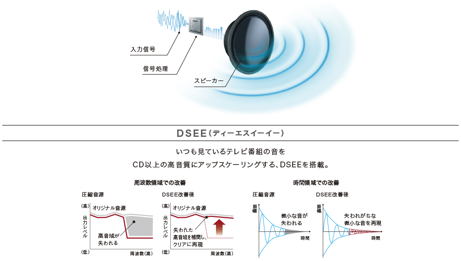 入力された音源(*)をCD以上の高解像度音源(48kHz/24bit)にアップスケーリングする「DSEE」を搭載。いつも見ているテレビ番組やネット動画などを美しい音質で楽しめます。
