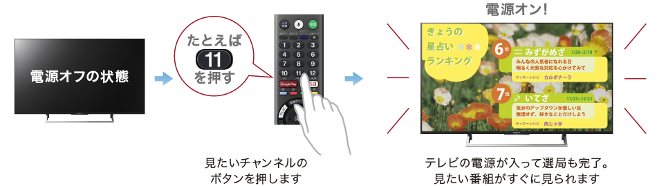 そんな方におすすめの機能が「チャンネルポン」。リモコンのチャンネルボタン(数字ボタン)で電源が入り、見たい番組をすぐに視聴できます。