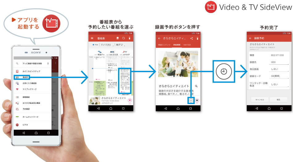 ソニーのスマートフォン向けアプリVideo & TV SideView(*)を使えば、家の中でも、外出先からでも、思い立ったそのときに録画予約できます。アプリでは、番組表だけでなく予約ランキングも確認できるので、番組の選び方が広がります。
